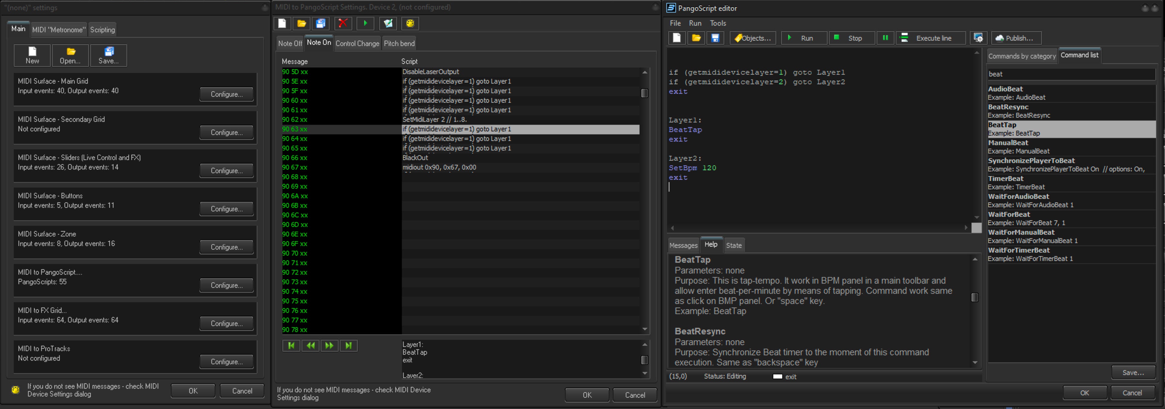 PangoScript is a tool inside of BEYOND that allows you to access the core of the software, and customize it to meet your needs. Using PangoScript, you can write individual code commands to execute just about any function you can imagine. For example, if you want to map out a MIDI, DMX or LIGHTING CONSOLE and customize what each knob, button, and slider does, this is easily achieved, using PangoScript.