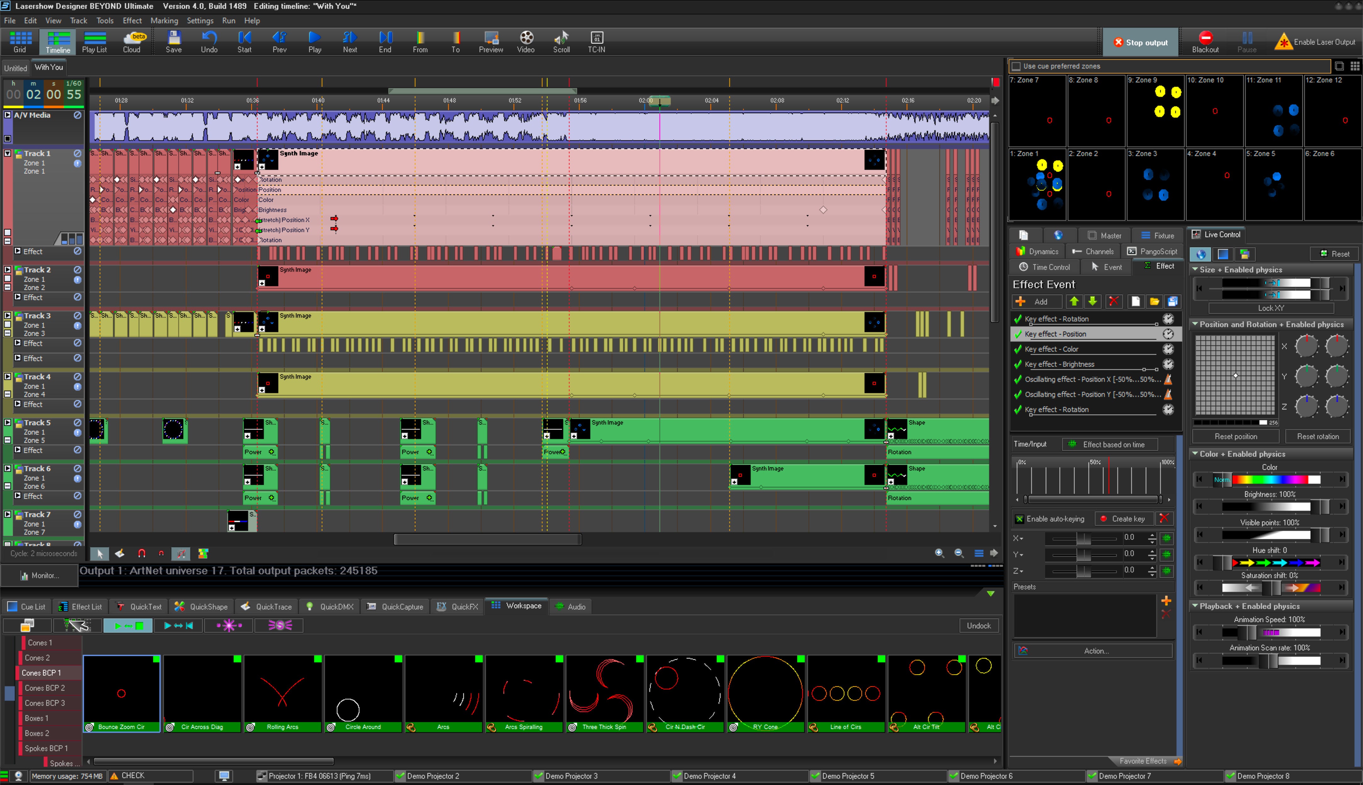 BEYOND多媒体时间线 – BEYOND多媒体时间线允许您对完整的激光表演进行编程,但是您也可以从时间线控制和编辑视频内容。这使得创建包含视频,激光和音频的多媒体节目变得容易。与我们的QuickShow程序相比,BEYOND的时间线还提供了更丰富的效果和编辑选项。 单击此处,了解更多信息