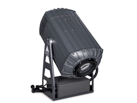 The Unity GOBO 600 is a 600-watt LED Gobo projector that offers all the features of modern professional gobos, including effects such as Zoom, Prism, Focus, Strobe and Dimmer. Its robust constriction made to IP65 standards allows it to be used in rainy conditions without worry.
