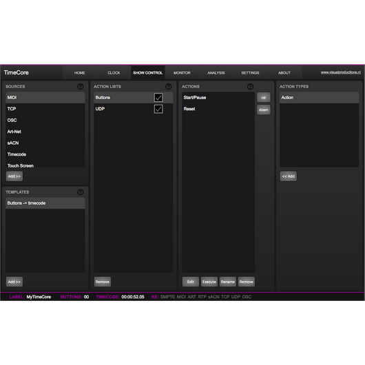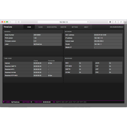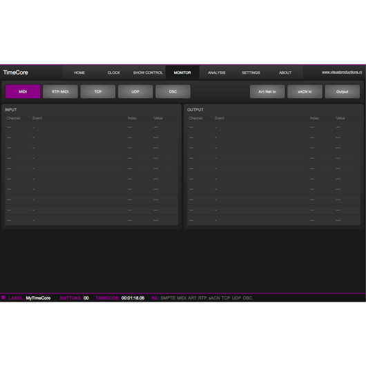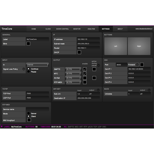 该单元支持接收和发送SMPTE(LTC),MTC和基于以太网的时间码(Art-Net)。 TimeCore能够在任何这些协议之间进行转换。它甚至可以在不同的帧率(24、25、29.97、30)之间转换。